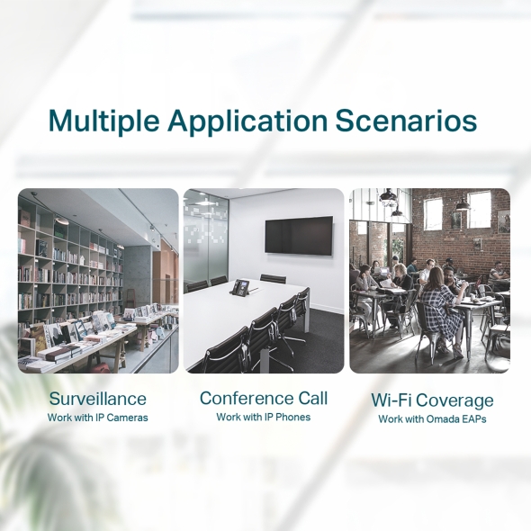 Compliance with the 802.3af/at PoE+ standard supports up to 30 W on each PoE port. The total 65 W PoE power budget* for the 4× PoE ports opens up a wide range of applications, such as surveillance for offices, dormitories, and small businesses. It is fully compatible with IP cameras, access points, IP phones, computers, printers, and more.