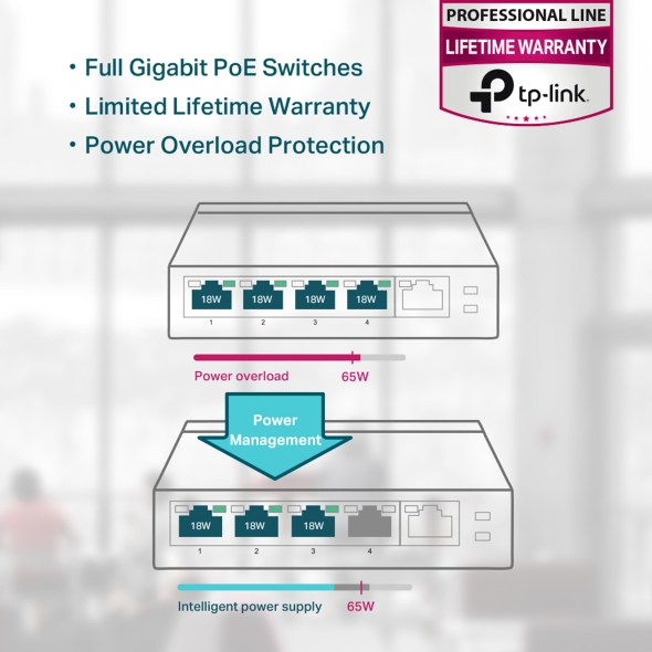 The TP-Link TL-SG1005P is a compact 5-port gigabit desktop switch with 4 PoE+ ports, providing both power and high-speed data connectivity to devices like IP cameras, wireless access points, and VoIP phones. In TL-SG1005P Each PoE+ port can supply up to 30W, and with a total PoE budget, it’s ideal for small businesses and home office networks looking for reliable, all-in-one connectivity. TL-SG1005P has a plug-and-play design ensures easy setup, and TL-SG1005P has energy-efficient features help reduce operational costs without compromising on performance.
