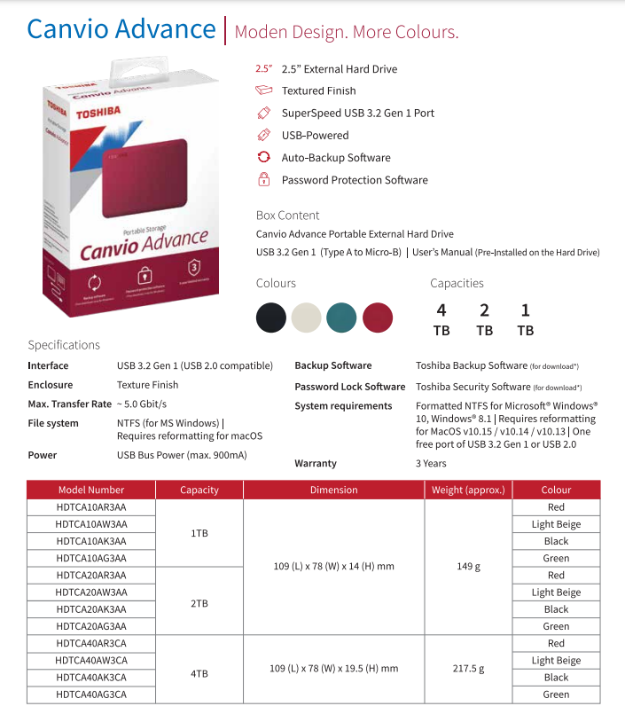The new Toshiba Canvio Advance 1TB HDTCA10AR3AA has features a stylish, textured design in three trendy colors. You choose from black, light beige and red based on your preference for up to 4 TB of mobile storage in the palm of your hand.