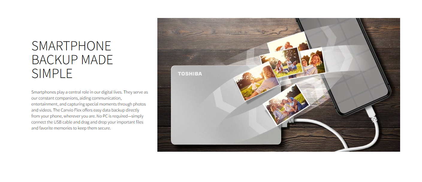 Let the Toshiba Canvio Flex 4TB HDTX140ASCCA become the long-term companion of your digital lifestyle. Your gadgets come and go, but you need your valuable data to last a lifetime. The Toshiba Canvio Flex 4TB HDTX140ASCCA works interchangeably with the major operating environments. Whether smartphone, tablet, Mac or Windows PC*, you simply connect your device with the USB cable to seamlessly access and share data between different devices and make copies of your precious data. The Toshiba Canvio Flex 4TB HDTX140ASCCA will become your cross-device storage solution for all your devices now and in the future.