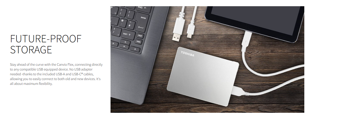 Toshiba Canvio Flex 4TB HDTX140ASCCA offers Flexible storage meets flexible style with a sleek, silver high-end finish and lightweight design that complements your smartphone, Mac, Windows PC, and other compatible tablet devices*.