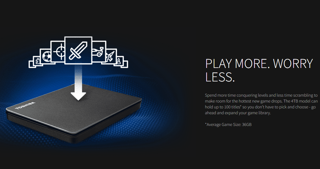 Keep a massive game library at your fingertips. The Canvio Gaming can store up to 100 games*. Take your game achievements and avatars on the road to compete with your friends Simply plug in the Toshiba Canvio Gaming 1TB HDTX110AK3AA drive into your compatible gaming console and you are ready to play your favorite games in your collection.