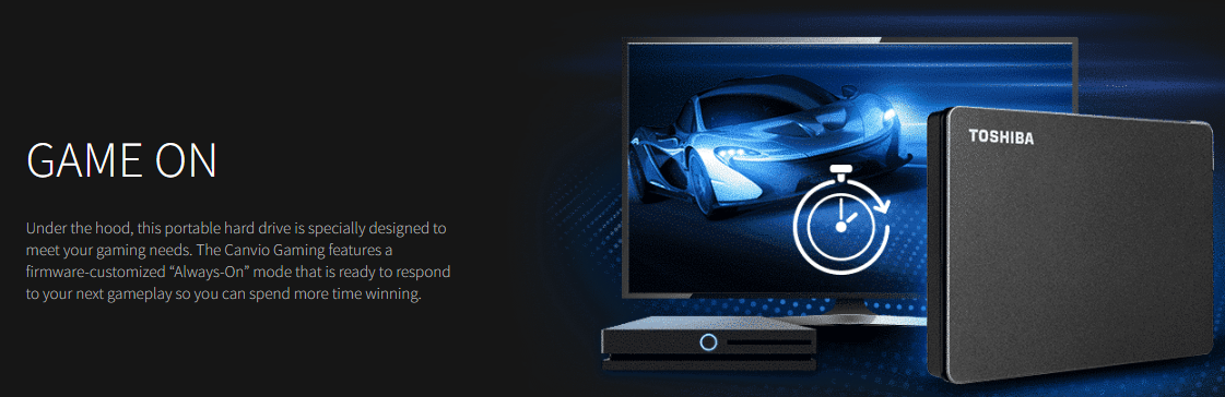Under the hood, this portable hard drive is specially designed to meet your gaming needs. The Toshiba Canvio Gaming 1TB HDTX110AK3AA features a firmware-customized “Always-On” mode that is ready to respond to your next gameplay so you can spend more time winning.