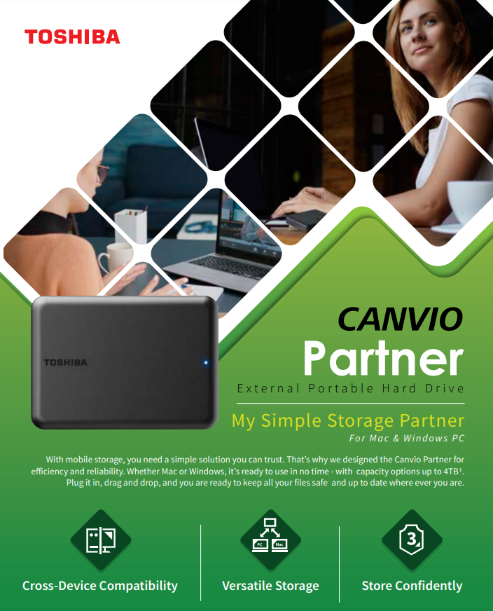 Toshiba Canvio Partner 1TB HDTB510AK3AB comes With mobile storage, you need a simple solution you can trust. That‘s why we designed the Toshiba Canvio Partner 1TB HDTB510AK3AB for efficiency and reliability. Whether Mac or Windows, it‘s ready to use in no time – Toshiba Canvio Partner 1TB HDTB510AK3AB comes with capacity options up to 4 TB. Plug it in, drag and drop, and you are ready to keep all your files safe and up to date wherever your journey takes you.]