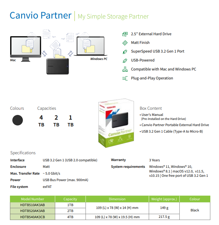 The Toshiba Canvio Partner 2TB HDTB520AK3AB hard drives focus on profile and classic design. The compact casing and flat top makes the Canvio Partner a true portable hard drive – easy to carry and store in any pocket or bag.