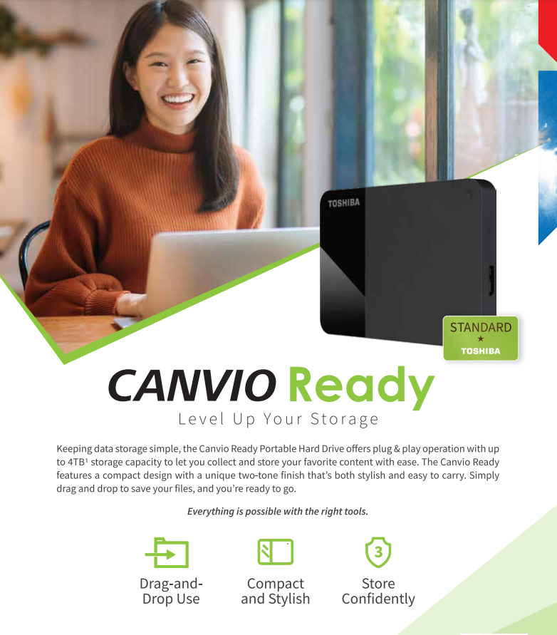 The Toshiba Canvio Ready 1TB HDTP310AK3AA is available in a range of different storage sizes up to 4 TB. So whatever your portable storage requirements, whether you’re saving documents, photos, movies, or a combination, Canvio Ready provides the ideal, high-capacity solution.