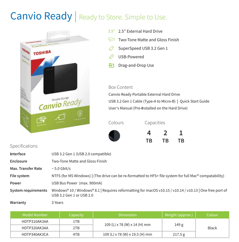 Box ContentCanvio Ready USB 3.2 Gen 1 cable (Type-A to Micro-B) Quick Start Guide User‘s manual (pre-installed on the hard drive)