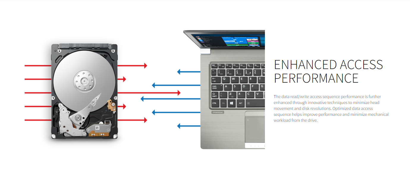 The data read/write access sequence performance is further enhanced through innovative techniques to minimize head movement and disk revolutions. Optimized data access sequence helps improve performance and minimize mechanical workload from the drive.