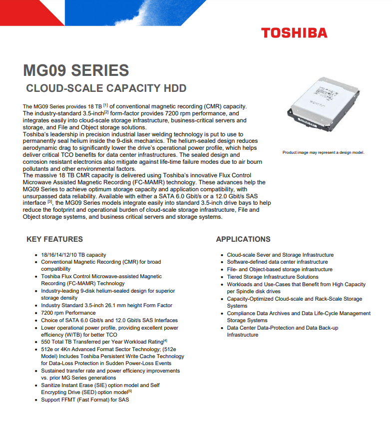Toshiba MG Series Capacity 18TB SAS MG09SCA18TE is Built with Toshiba’s 9-disk helium-sealed technology, the MG Series Capacity 18TB SAS MG09SCA18TE achieves high storage density while minimizing power consumption and operational costs. Advanced features such as rotational vibration compensation, persistent write cache, and a 550TB/year workload rating ensure durability and reliability, making it an excellent solution for mission-critical storage requirements.