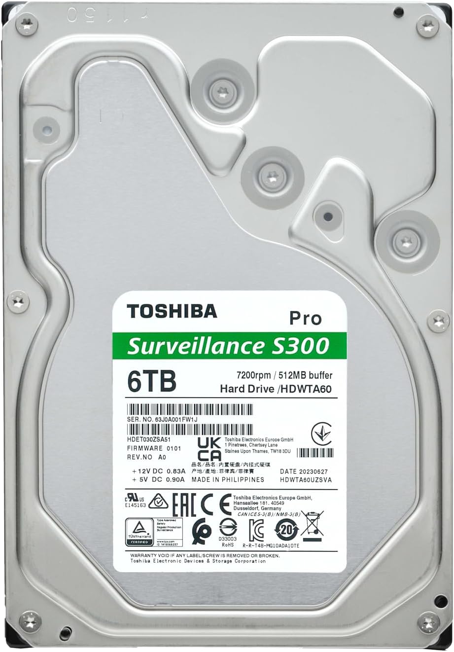 TOSHIBA S300 Pro 6TB 3.5″ SATA 7200 RPM Hard Drive with 512MB cache, 6.0 Gbps interface, and 24/7 reliability. Ideal for DVR/NVR surveillance systems, supporting up to 64 HD video streams.