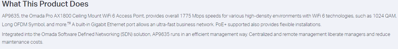 The TP-Link AP9635 is a Wi-Fi 6 AX1800 access point designed for high-performance, high-density environments. It offers up to 1800 Mbps total speed, utilizing OFDMA and MU-MIMO for efficient multi-device support. PoE+ support simplifies installation, while Omada cloud management ensures easy configuration and monitoring. Ideal for businesses, schools, and retail environments, it provides secure, reliable Wi-Fi with seamless roaming and enhanced network efficiency.
