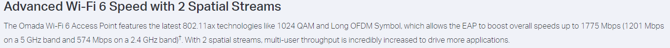 Tp-Link AP9635 is Powered by the latest Wi-Fi 6 (AX) technology, the Tp-Link AP9635 utilizes OFDMA and MU-MIMO technologies to increase network efficiency and reduce congestion, even in environments with many connected devices. Tp-Link AP9635 has 2.4 GHz band supports up to 574 Mbps, while the 5 GHz band supports up to 1201 Mbps, providing the bandwidth needed for high-demand applications like HD streaming, online conferencing, and gaming.