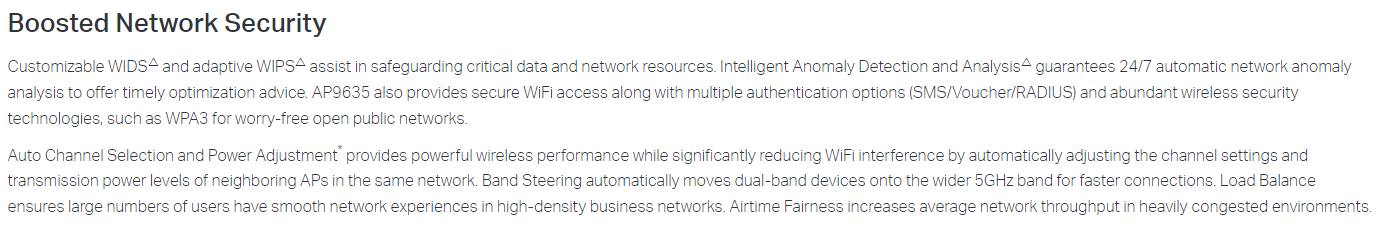 Wireless Security• Captive Portal Authentication • Access Control • Maximum number of MAC Filter: 4,000 • Wireless Isolation Between Clients • SSID VLAN • WIDS/WIPS • Rogue AP Detection • WPA-Personal/Enterprise, WPA2-Personal/Enterprise, WPA3-Personal/Enterprise