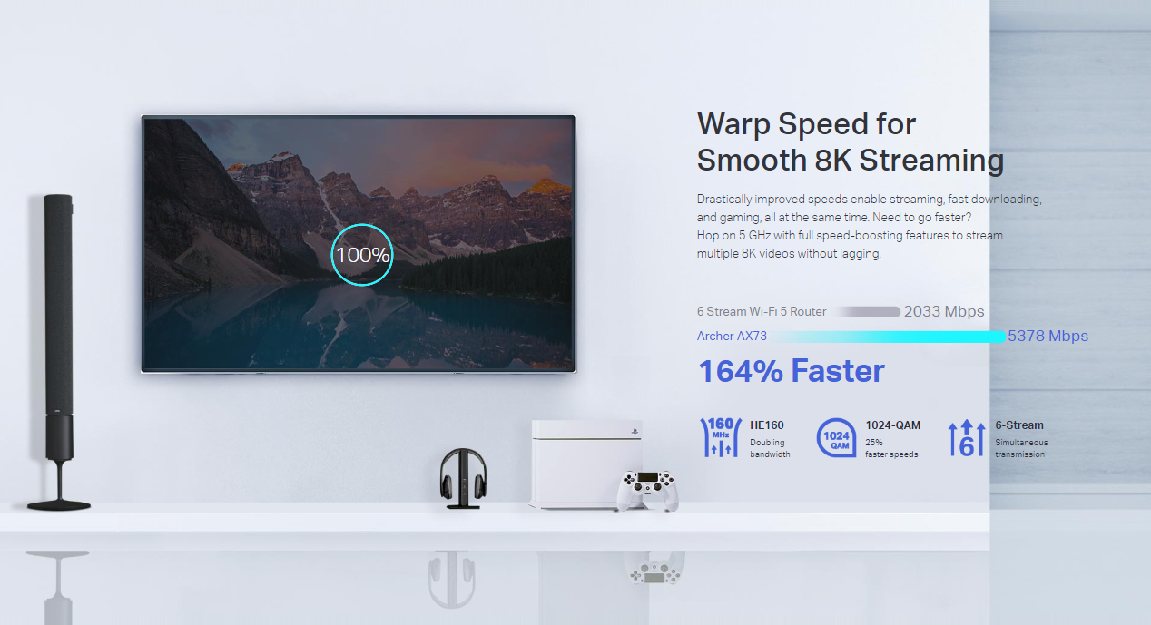 The TP-Link Archer AX73 AX5400 Dual-Band Gigabit Wi-Fi 6 Router offers AX5400 speeds, advanced Wi-Fi 6 features, and enhanced security, ensuring fast, reliable, and secure connectivity for modern homes with multiple connected devices.