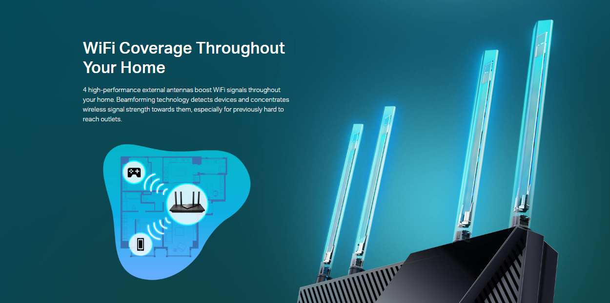6× Fixed High-Performance Antennas Multiple antennas form a signal-boosting array to cover more directions and large areasBeamforming Concentrates wireless signal strength towards clients to expand WiFi rangeHigh-Power FEM Improves transmission power to strengthen signal coverage4T4R Multiple streams in the same band strengthen the fault tolerance in transmission