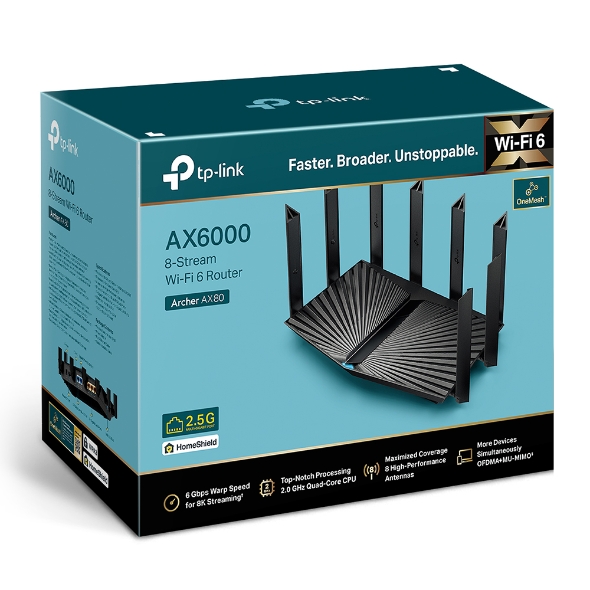 The TP-Link Archer AX80 AX6000 8-Stream Wi-Fi 6 Router delivers AX6000 speeds, next-gen Wi-Fi 6 features, and a 2.5G WAN port, providing fast, reliable, and secure connectivity for heavy internet users with multiple devices.