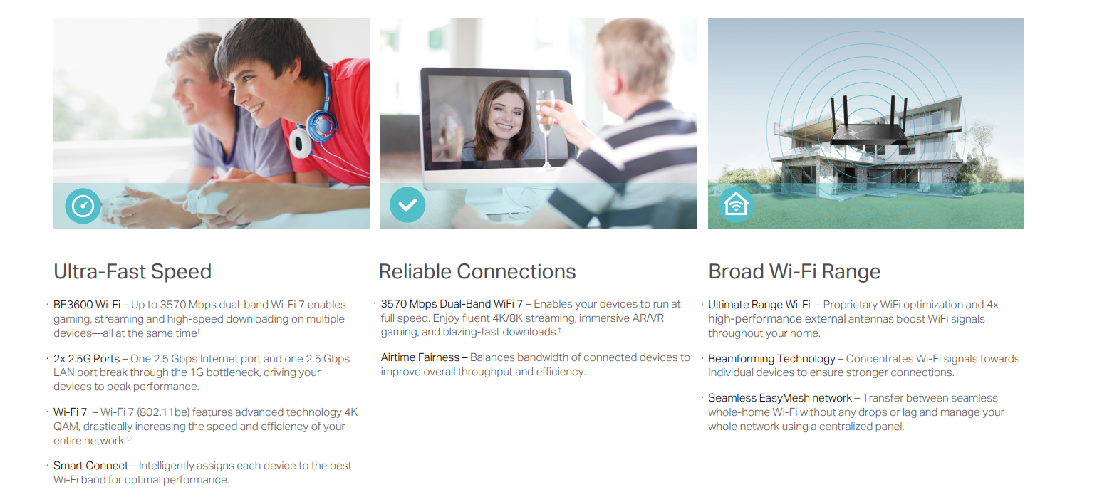 Deco Series (Mesh WiFi Systems) – Whole-home mesh WiFi with AI-driven optimization, seamless roaming, and parental controls. Ideal for large homes and offices.