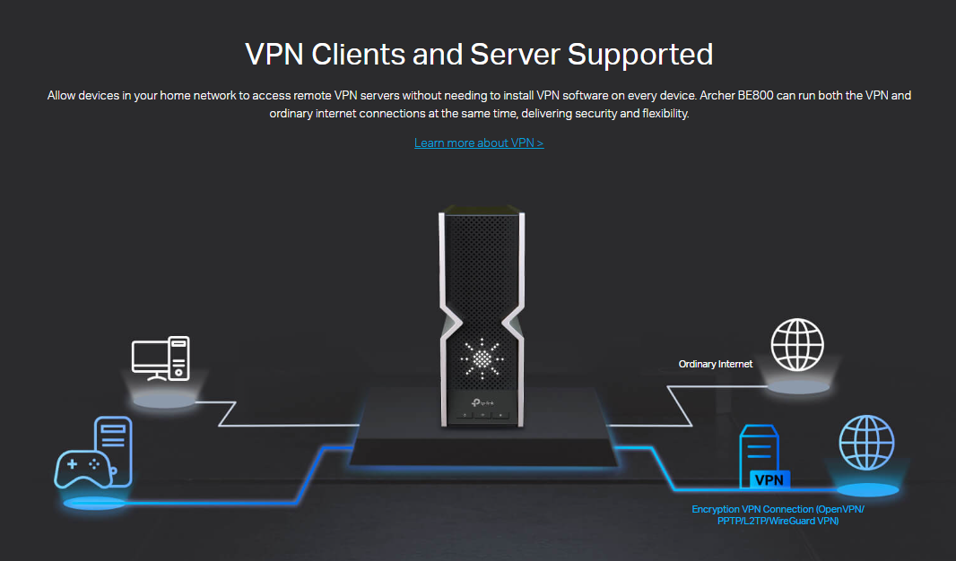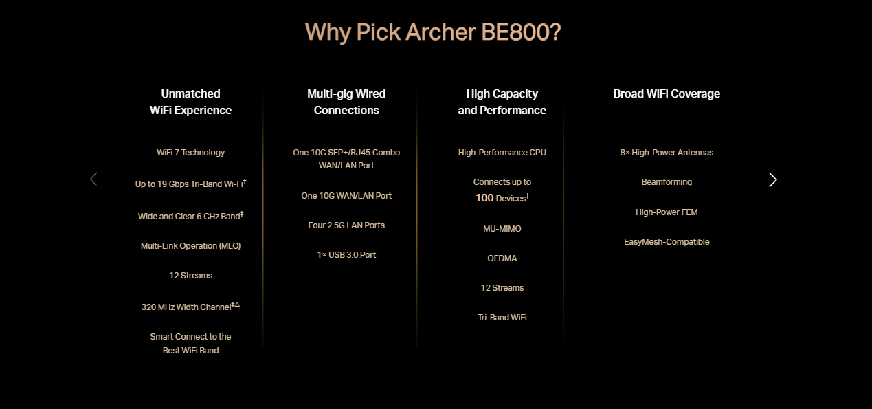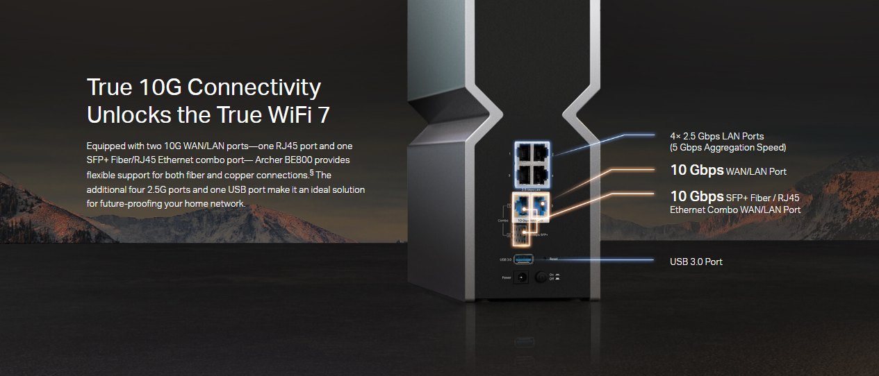 TP-Link Archer BE800 is Featuring 8 high-performance antennas and dual 10G ports, the TP-Link Archer BE800 ensures optimal coverage and lightning-fast wired connectivity for large homes and offices. TP-Link Archer BE800 router also supports AI-driven network optimization, advanced QoS, and robust TP-Link HomeShield security to protect your devices and network.