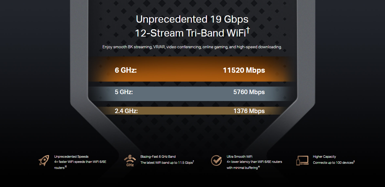 WiFi SpeedsBE19000 • 6 GHz: 11520 Mbps (802.11be) • 5 GHz: 5760 Mbps (802.11be) • 2.4 GHz: 1376 Mbps (802.11be)