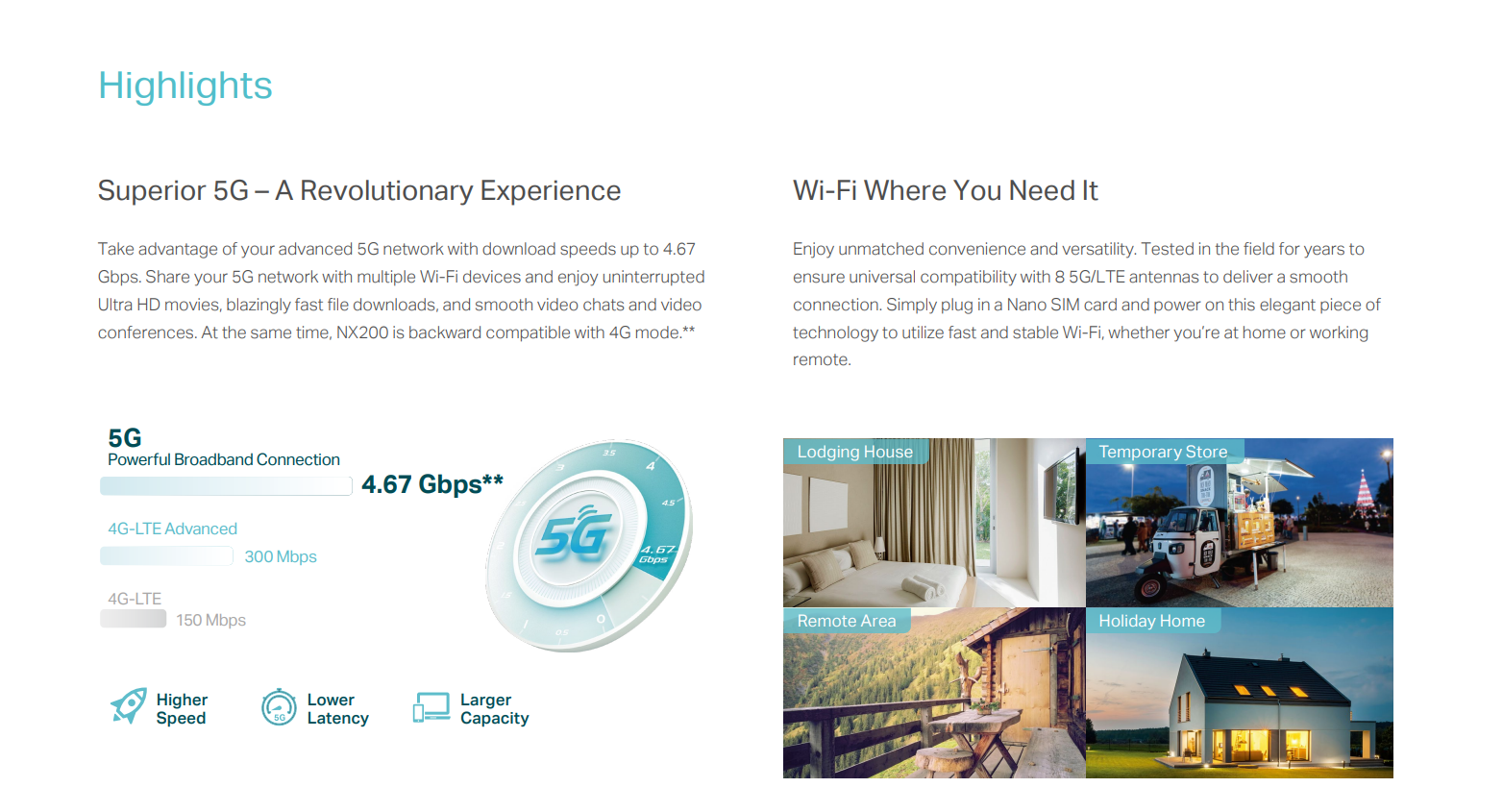 TP-Link Archer NX200 5G AX1800 has 5G compatibility offers unprecedented wireless broadband speeds, ideal for homes and offices requiring high-speed internet without traditional wired connections. TP-Link Archer NX200 5G AX1800 is Featuring OFDMA and MU-MIMO technology, the TP-Link Archer NX200 5G AX1800 efficiently handles multiple devices simultaneously, reducing latency and boosting network performance. The router is equipped with Gigabit Ethernet ports, providing ultra-fast wired connections for devices like PCs, gaming consoles, or NAS.