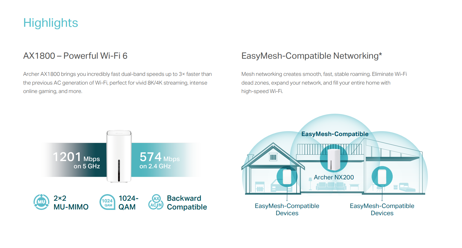 • AX1800 Dual-Band Wi-Fi 6 Speed – 1201 Mbps (5 GHz) + 574 Mbps (2.4 GHz).