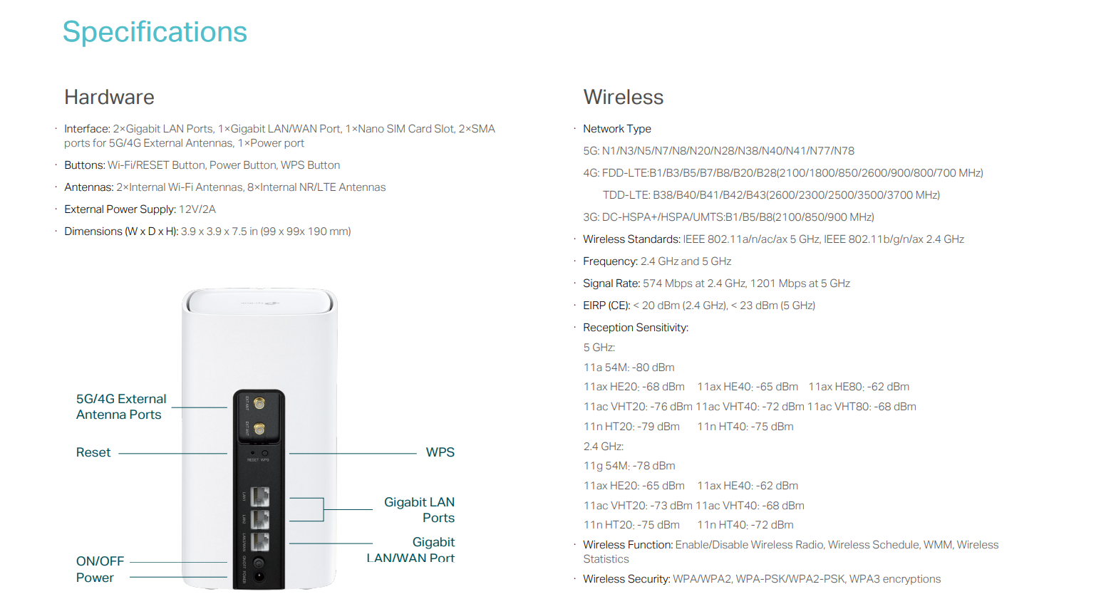 Interface1 × 10/100/1000 Mbps LAN/WAN Port 2 × 10/100/1000 Mbps LAN Ports 1 × Nano SIM Card Slot 2 × 5G/4G External Antenna Ports