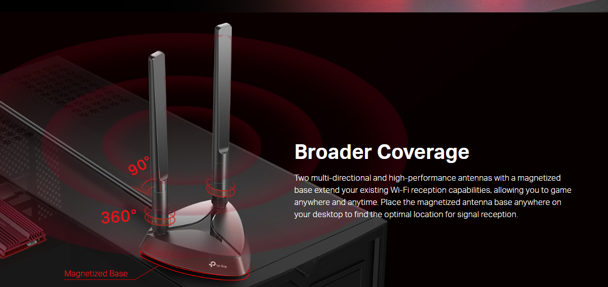 Two multi-directional and high-performance antennas with a magnetized base extend your existing Wi-Fi reception capabilities, allowing you to game anywhere and anytime. Place the magnetized antenna base anywhere on your desktop to find the optimal location for signal reception.