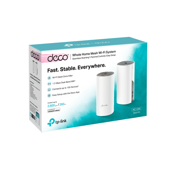 Deco E4 is the simplest way to guarantee a strong Wi-Fi signal in every corner of your home up to 2,800 square feet (2-pack). Wireless connections and optional Ethernet backhaul work together to link Deco units, providing even faster network speeds and truly seamless coverage. Want more coverage? Simply add another Deco.