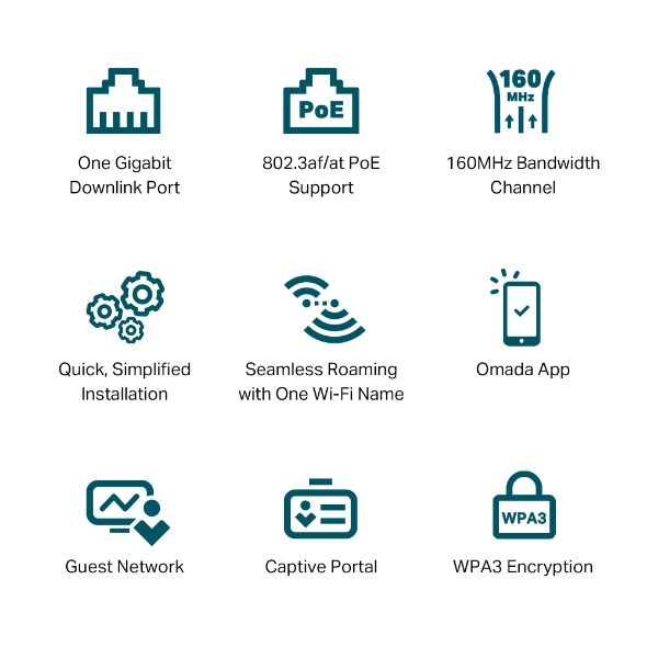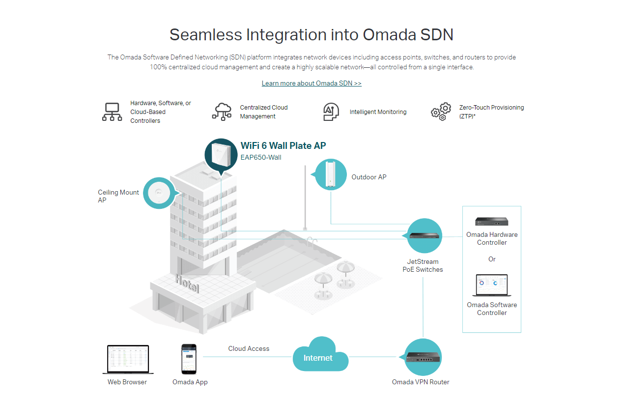 • Centralized Cloud Management: Integrates into Omada SDN for cloud access and remote management.