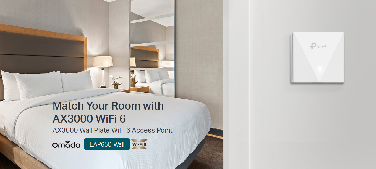 The TP-Link EAP650 Wall AX3000 Wall Plate WiFi 6 Access Point offers high-speed Wi-Fi 6 in a space-saving, wall-mounted design, ideal for hotels, apartments, and office rooms requiring powerful in-room connectivity.