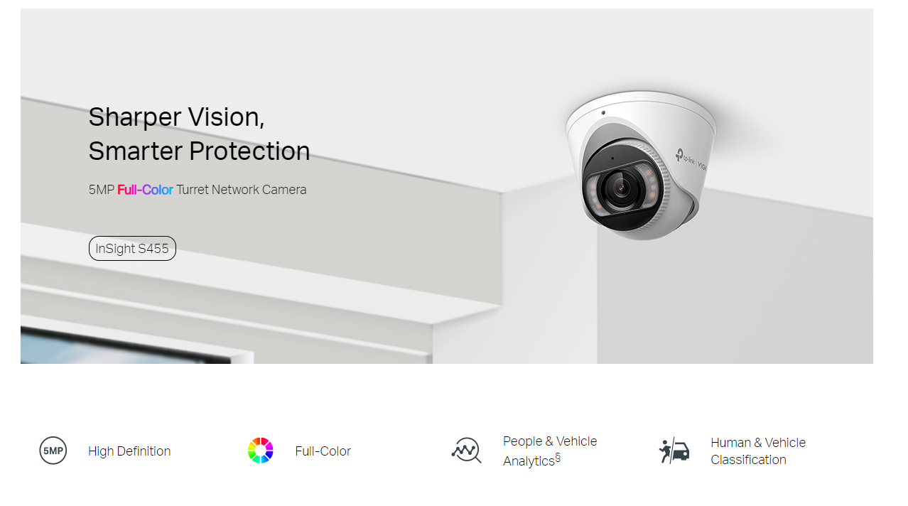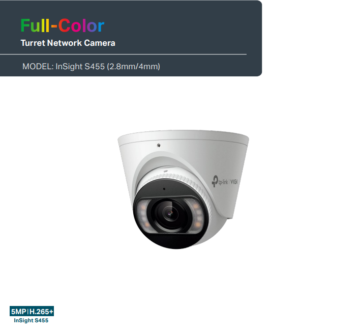 The TP-Link InSight S455 4mm is a 5MP full-color turret network camera designed for professional-grade surveillance, delivering high-resolution imaging, advanced smart analytics, and robust performance in various lighting and environmental conditions.