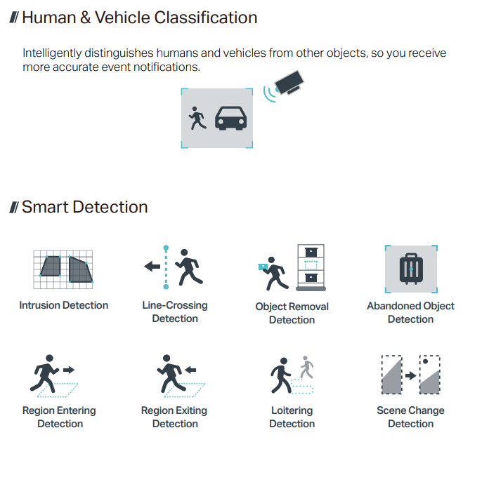 Smart Event• Intrusion Detection • Line-Crossing Detection • Region Entering Detection • Region Exiting Detection • Object Abandoned Detection • Object Removal Detection • Loitering Detection • People Detection • Vehicle Detection • Abnormal Sound Detection • Scene Change Detection