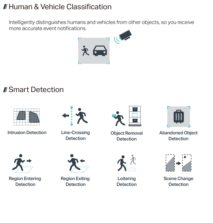 Smart Event• Intrusion Detection • Line-Crossing Detection • Region Entering Detection • Region Exiting Detection • Object Abandoned Detection • Object Removal Detection • Loitering Detection • People Detection • Vehicle Detection • Abnormal Sound Detection • Scene Change Detection