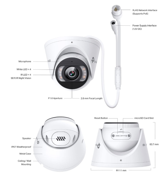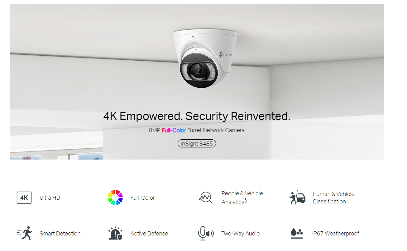 The Tp-Link InSight S485 2.8mm is an advanced 8MP 4K Ultra HD turret network camera offering full-color video around the clock, enhanced with human and vehicle classification, and equipped with IP67-rated weatherproofing for durable outdoor use. It features efficient H.265+ video compression, ensuring reduced bandwidth and storage without compromising quality.