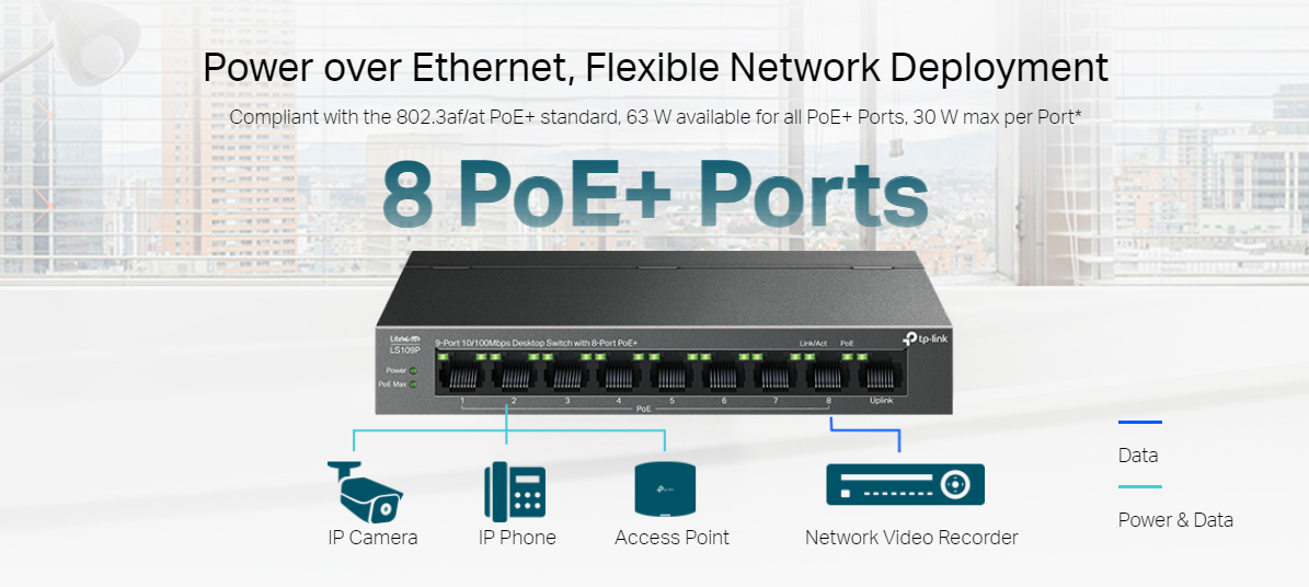 • 63 W PoE Budget: Eight 10/100 Mbps 802.3af/at-compliant PoE ports easily connect and power fixed devices like IP cameras, access points, and IP phones via a single cable. Up to 30 W PoE output is supported by each PoE port.*