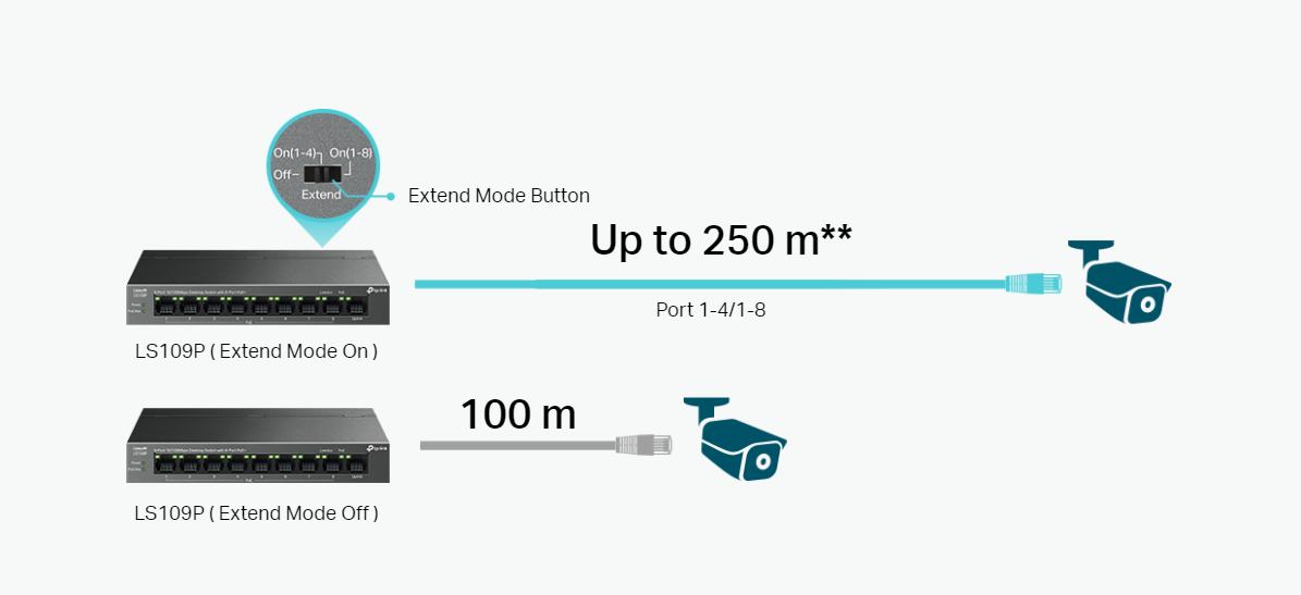 • Up to 250 m PoE Transmission: With Extend Mode, PoE transmission distance reaches up to 250m, perfect for surveillance camera deployment in large areas.**