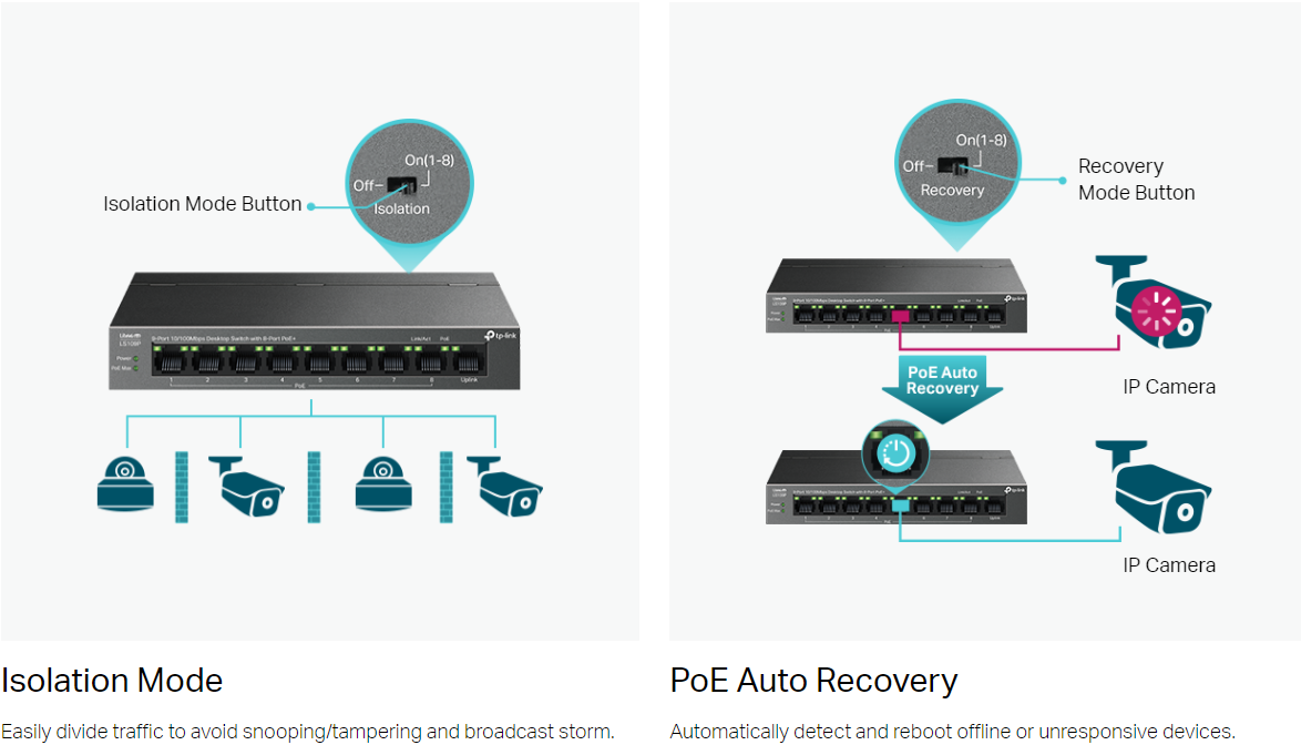 Advanced Features• Extend Mode Button (Ports 1–4/1–8, Up to 250 m PoE power supply and data transmission) • Isolation Mode Button (Ports 1–8) • PoE Auto Recovery Button (Ports 1–8) • Compatible With IEEE 802.3af/at Compliant PDs • Mac Address Auto-Learning and Auto-Aging • IEEE 802.3x Flow Control • Green Technology