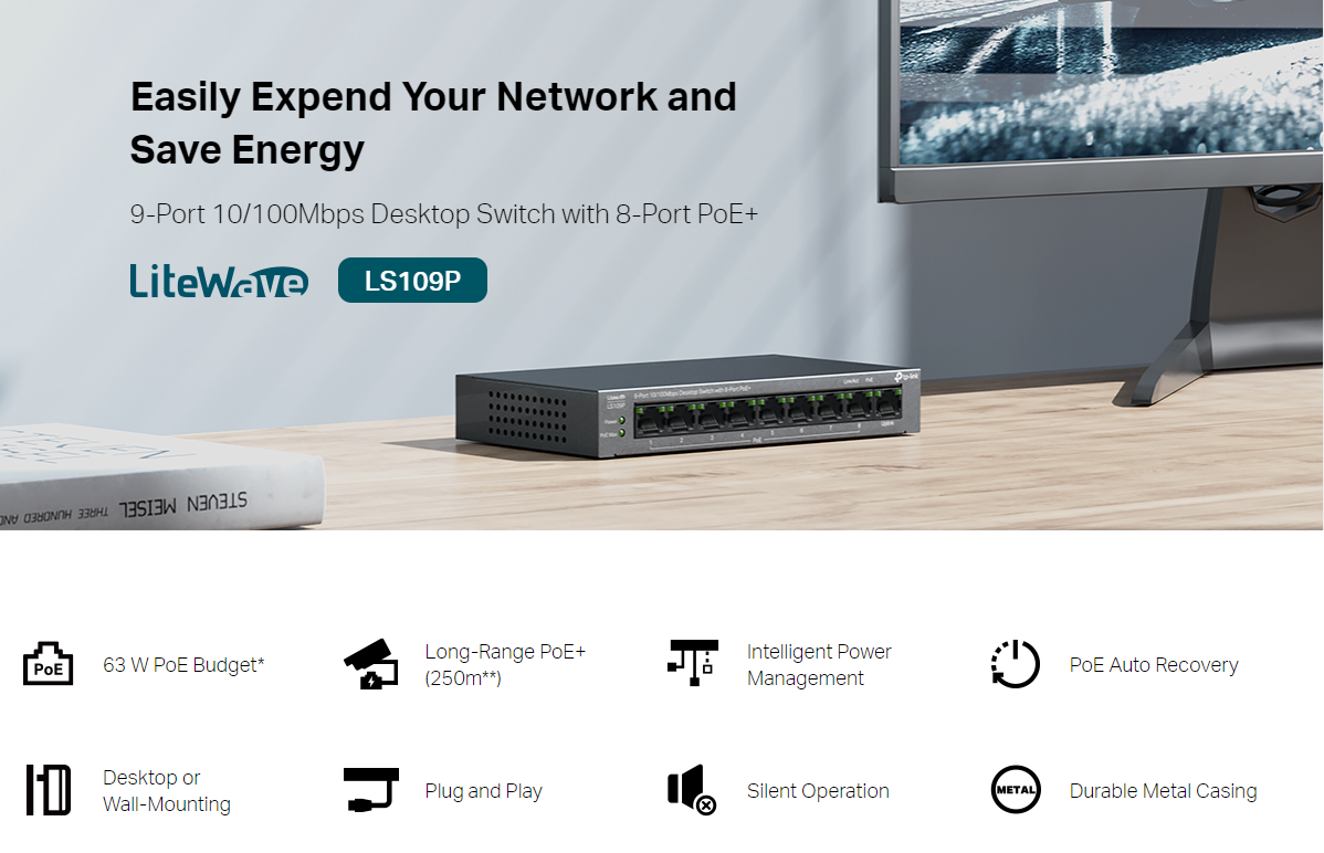 TP-Link LS109P 9-Port 10/100Mbps Desktop Switch with 8-Port PoE+, 63 W PoE Budget