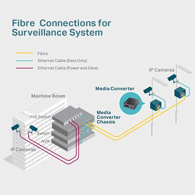 The TP Link MC110CS enables Ethernet connections over single-mode fiber up to 20 kilometers, providing an efficient solution for extending network reach in large-scale environments.
