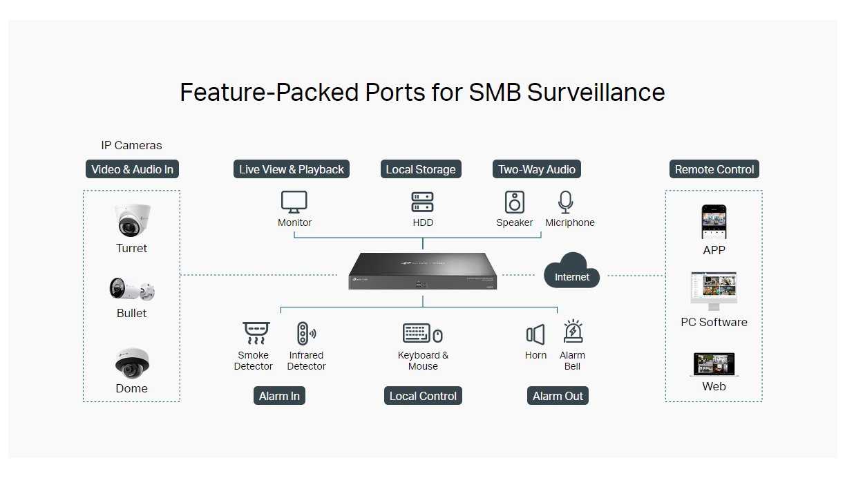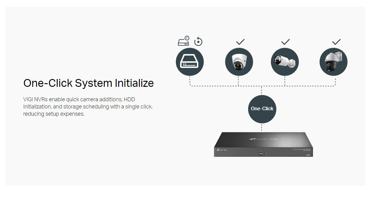 TP-Link NVR4064H comes With support for H.265+ video compression, the NVR4064H ensures efficient storage management while maintaining high-quality video recording. It offers 4K video output for ultra-clear viewing and is compatible with TP-Link’s VIGI series cameras for seamless integration. The system features smart search and playback capabilities, allowing for quick and easy access to recorded footage, enhancing security operations.