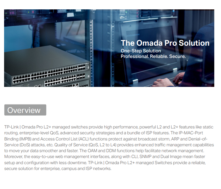 • Management Flexibility: Supports a selection of management methods, including centralized cloud management with the Omada Pro Controller, CLI, Web GUI, and SNMP.
