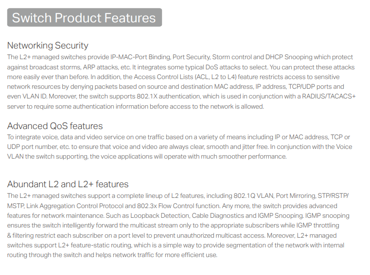Security• IP-MAC-Port Binding - 512 Entries - DHCP Snooping - ARP Inspection - IPv4 Source Guard: 100 Entries • IPv6-MAC-Port Binding -512 Entries - DHCPv6 Snooping - ND Detection - ND Snooping - IPv6 Source Guard: 100 Entries • DoS Defend • DHCP Filter • Static/Dynamic Port Security - Up to 64 MAC addresses per port • Broadcast/Multicast/Unicast Storm Control - kbps/ratio/pps control mode • 802.1X - Port base authentication - Mac base authentication - VLAN Assignment - MAB - Guest VLAN - Support RADIUS authentication and accountability • AAA (including TACACS+) • Port Isolation • Secure web management through HTTPS with SSLv3/TLS 1.2 • Secure Command Line Interface (CLI) management with SSHv1/SSHv2 • IP/Port/MAC-based access control