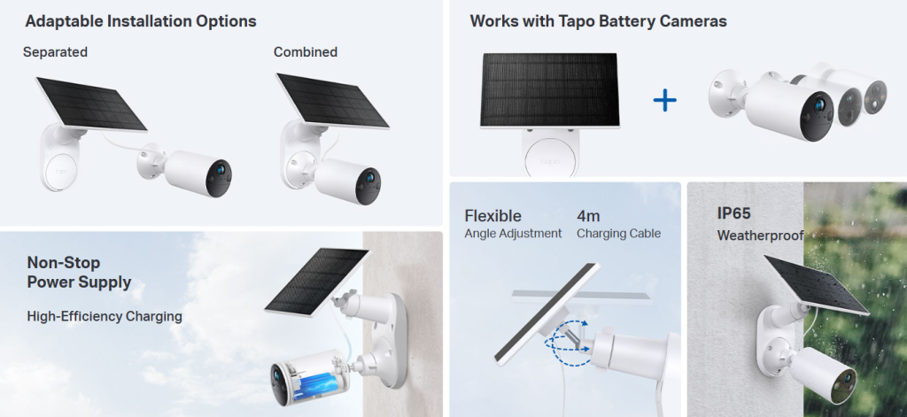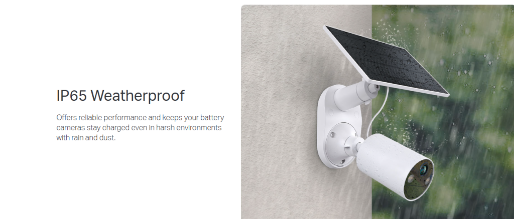 TP-Link Tapo A201 is compatible with a wide range of Tapo battery cameras—including Tapo C400, C410, C420, and C425—the A201 ensures reliable energy in any weather. Its IP65-rated design shields it from rain and dust, making it ideal for outdoor installations in diverse climates.