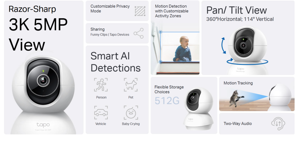 The TP-Link Tapo C230 AI Home Security Camera delivers sharp 3K 5MP ultra-clear video, full pan/tilt coverage, AI-powered motion detection, and advanced night vision up to 40 ft. With two-way audio, sound & light alarms, and support for local and cloud storage, it’s the perfect smart surveillance solution for modern homes.