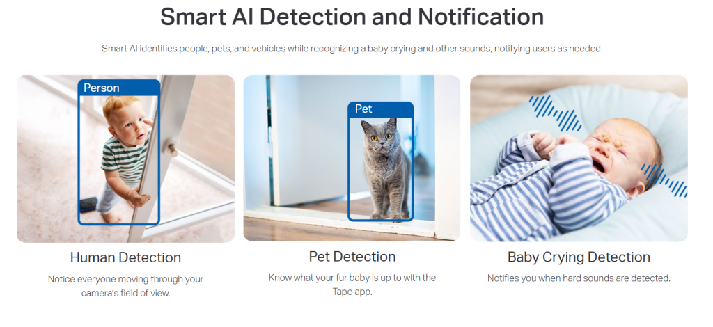 Smart AI Detection – Detects people, vehicles, pets, crying, barking, and more