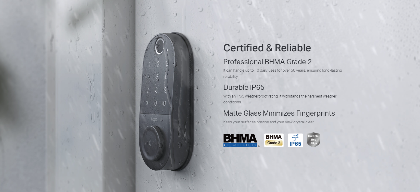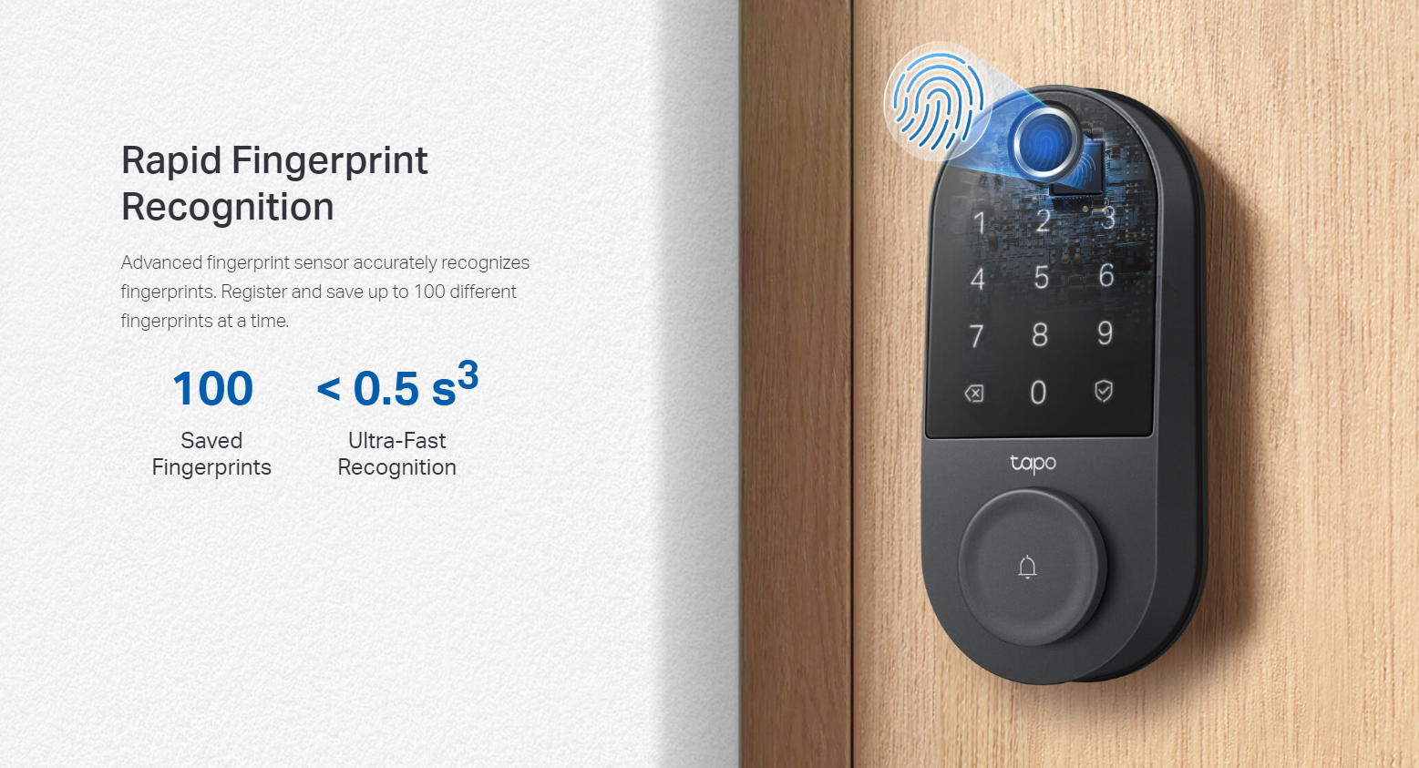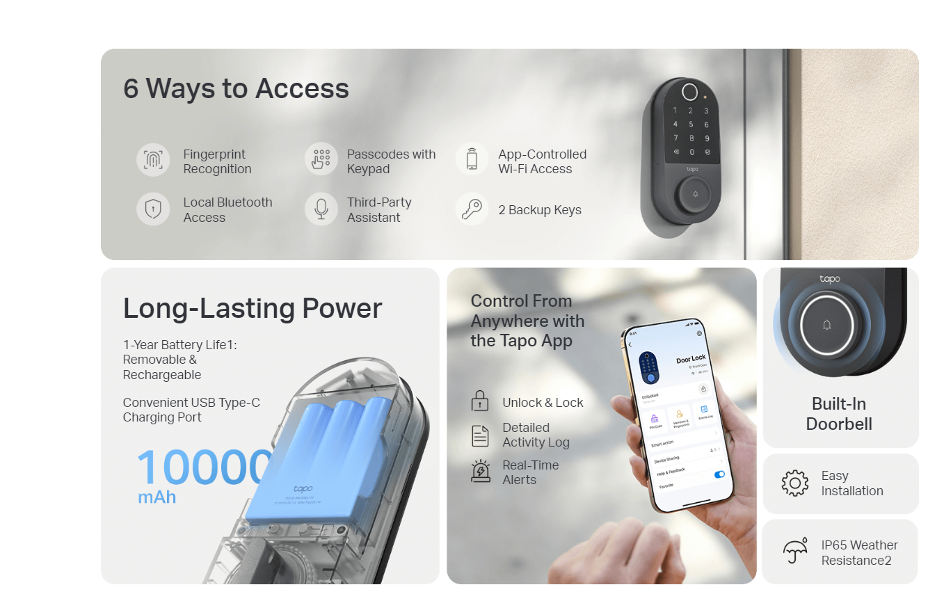 • 6 Ways to Securely Access: Unlock with the Tapo app, by fingerprint, Bluetooth, keypad, Smart Assistant, or with included backup keys.