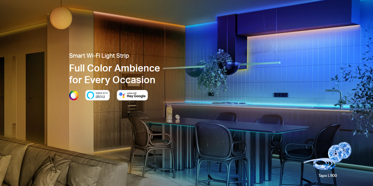 Tp-link Tapo L900-10 flexible light strip offers easy installation, customizable lengths, scheduling, Away Mode for security, and voice control with Alexa or Google Assistant. Connect via Wi-Fi, Tapo app, or smart assistants—no hub required. Save lighting presets for added convenience.