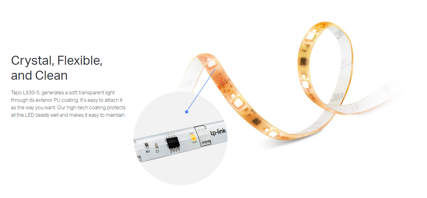 TP-link Tapo L930-5 advanced light strip features 50 addressable color zones for precise zonal color control, complemented by extra white LEDs for practical everyday lighting. Enjoy animated lighting effects through the Tapo App and dynamic Music Sync that matches the beat of your surroundings. Compatible with Apple HomeKit, Alexa, and Google Assistant, it offers seamless voice control. The durable PU coating ensures a tidy, long-lasting design, while the 3M adhesive allows for easy installation on any surface. With a stable Wi-Fi connection, no hub is required, making setup simple through the Tapo App.