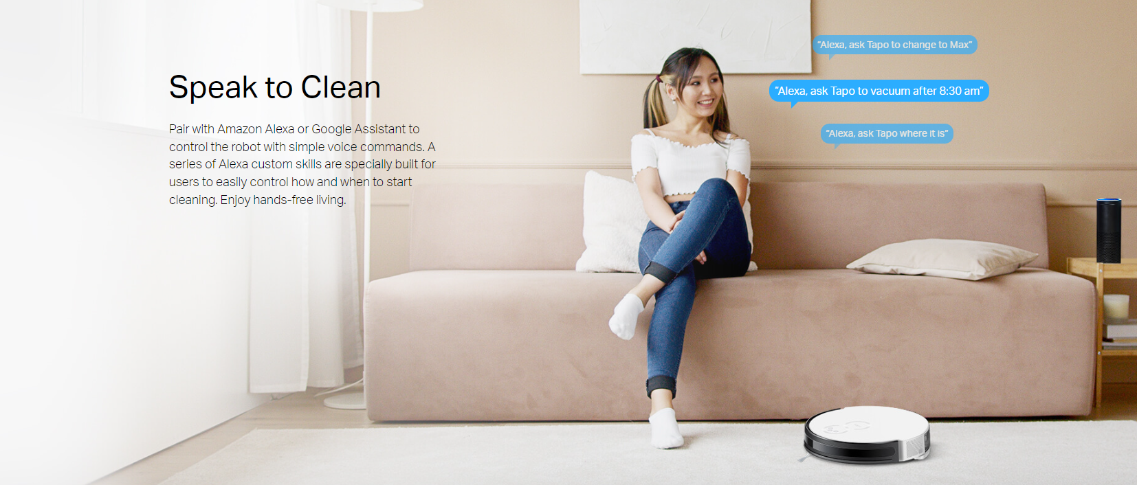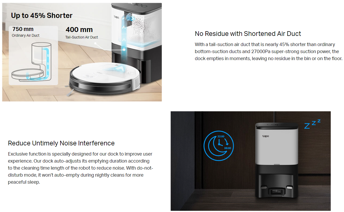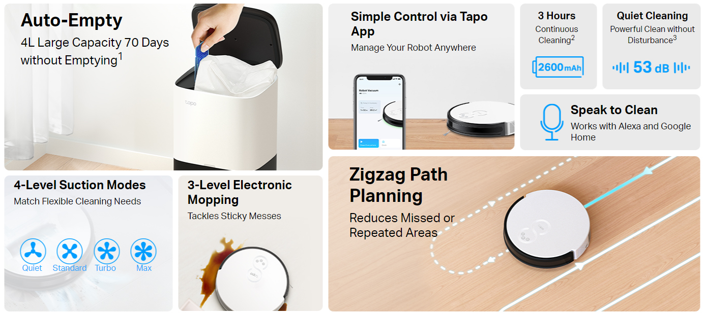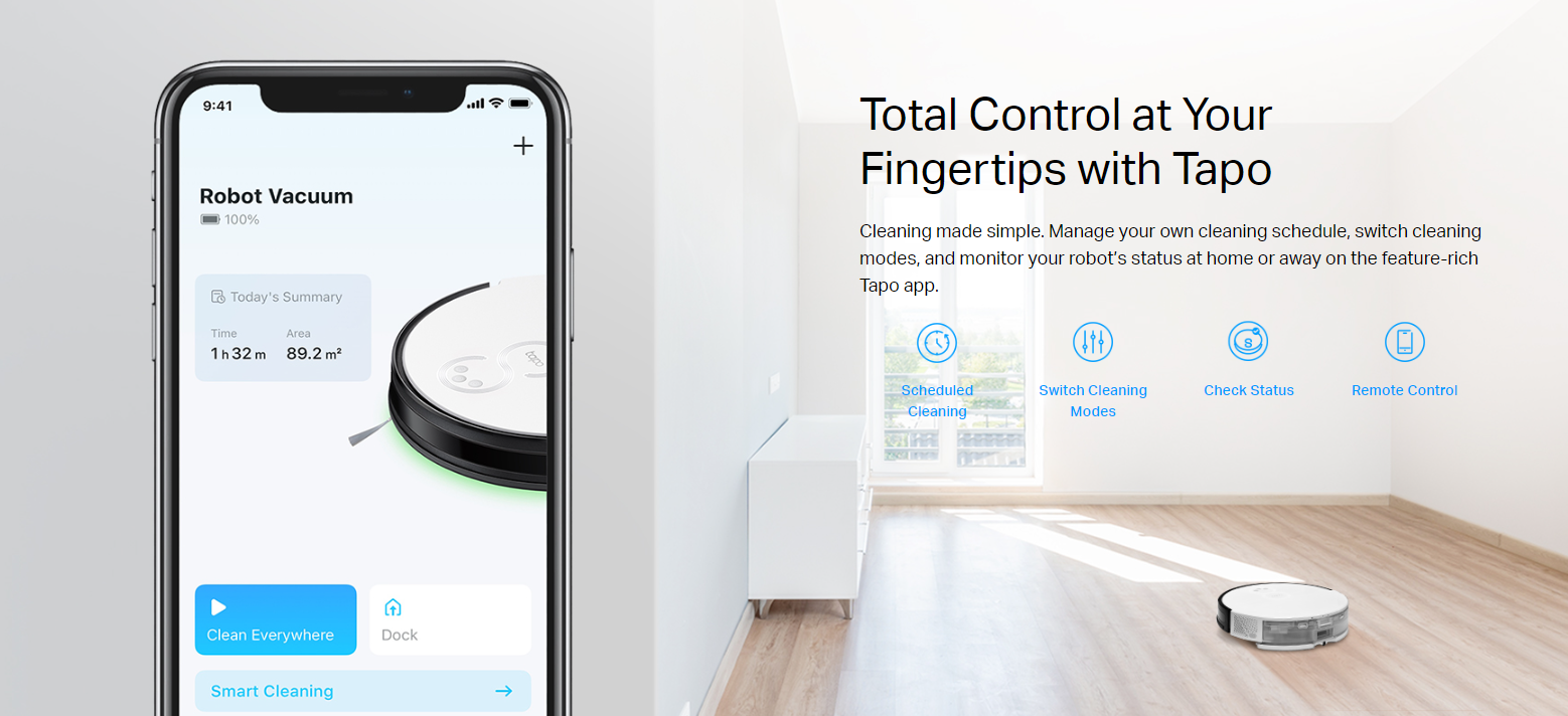 • Simple Control via Tapo App – Tailor scheduling and switch clean modes at home or away.