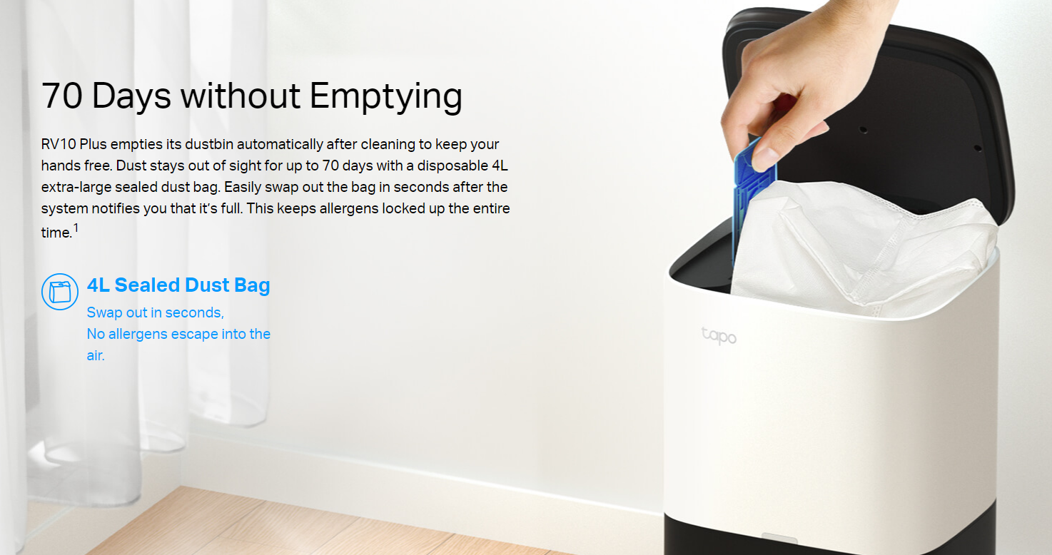 • Auto-Empty with 4L Large Dust Bag – Automatically empties the dustbin after cleaning to keep your hands free for up to 70 days.1